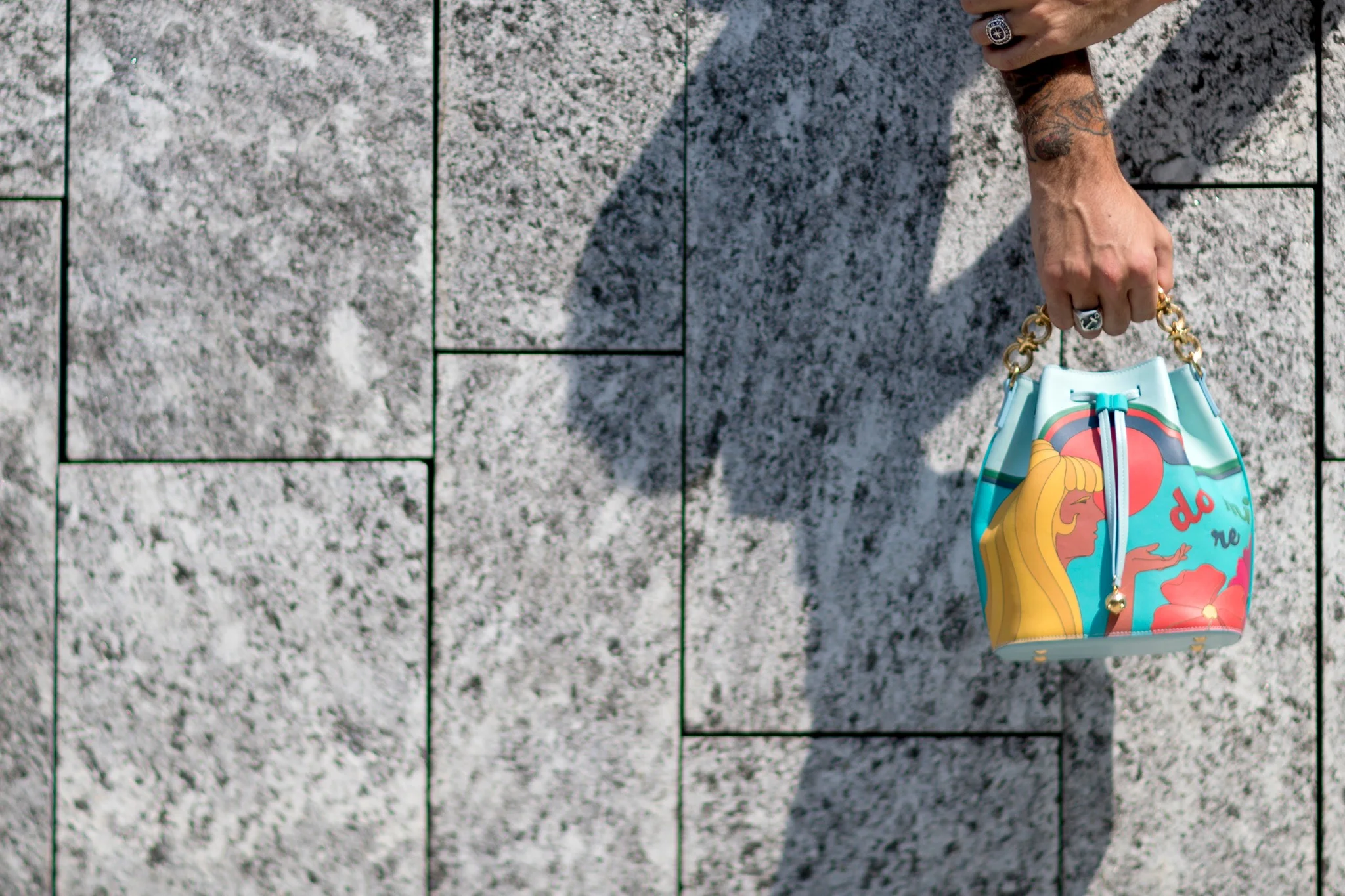 Each of the bags style is now named after a Greek Goddess and includes Bia, (Goddess of Strength) Hebe, (Goddess of Youth and the signature half-moon bags), Pheme and Hera. The collection also features for the first time a selection of clutches called miracle.To emphasise the craftsmanship, the collection uses simple colours such as black, dark and powder blue, burgundy and emerald green.In keeping with his typical pop-art style prints, the collection features pop drawings of the Goddesses, along with detailing in embroidery, prints and stitching.