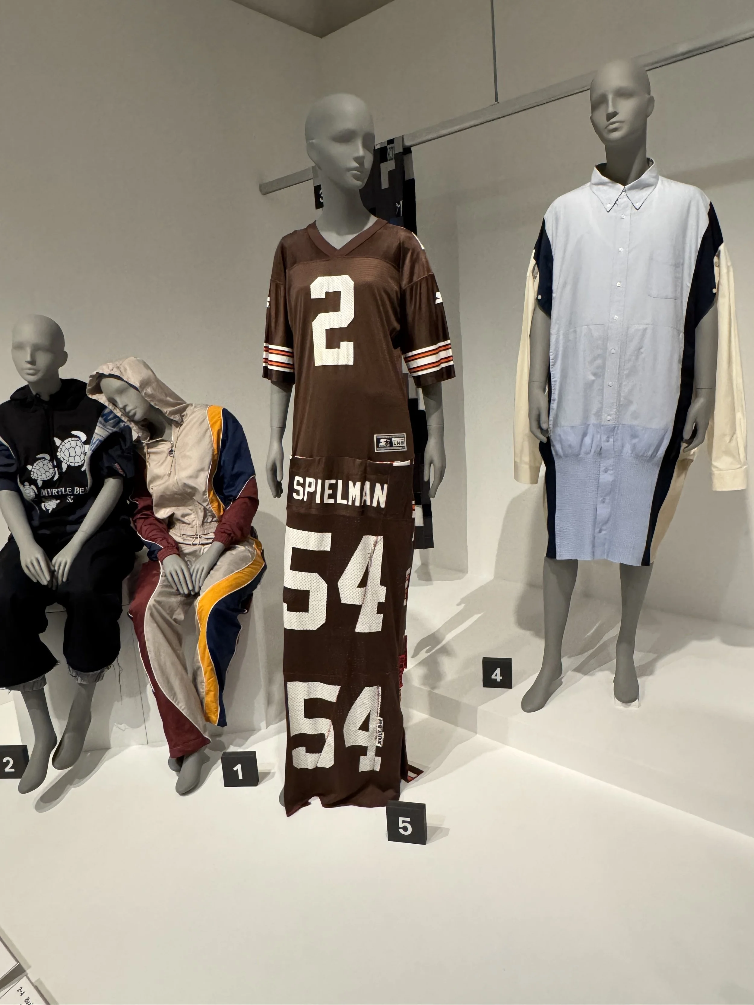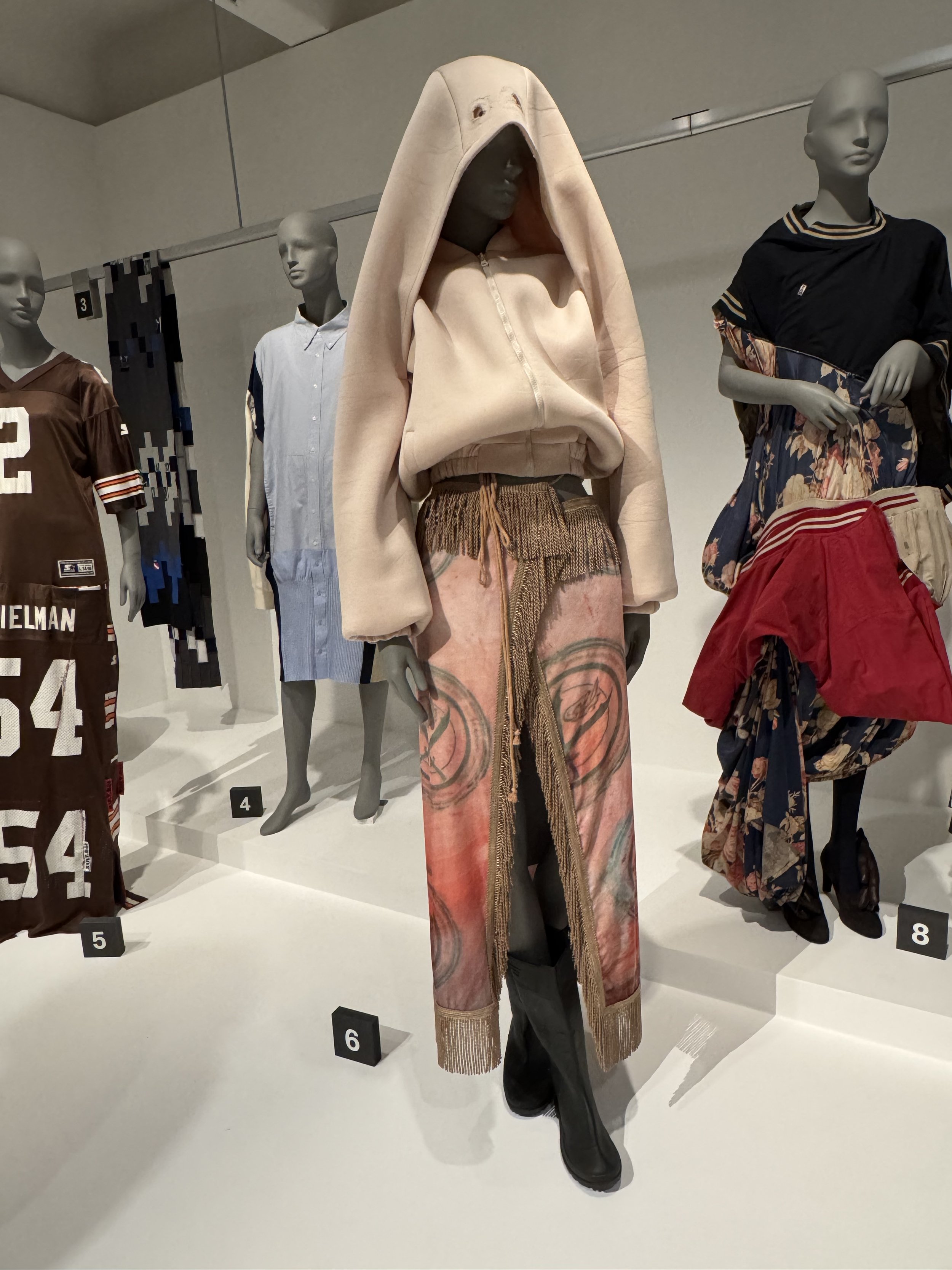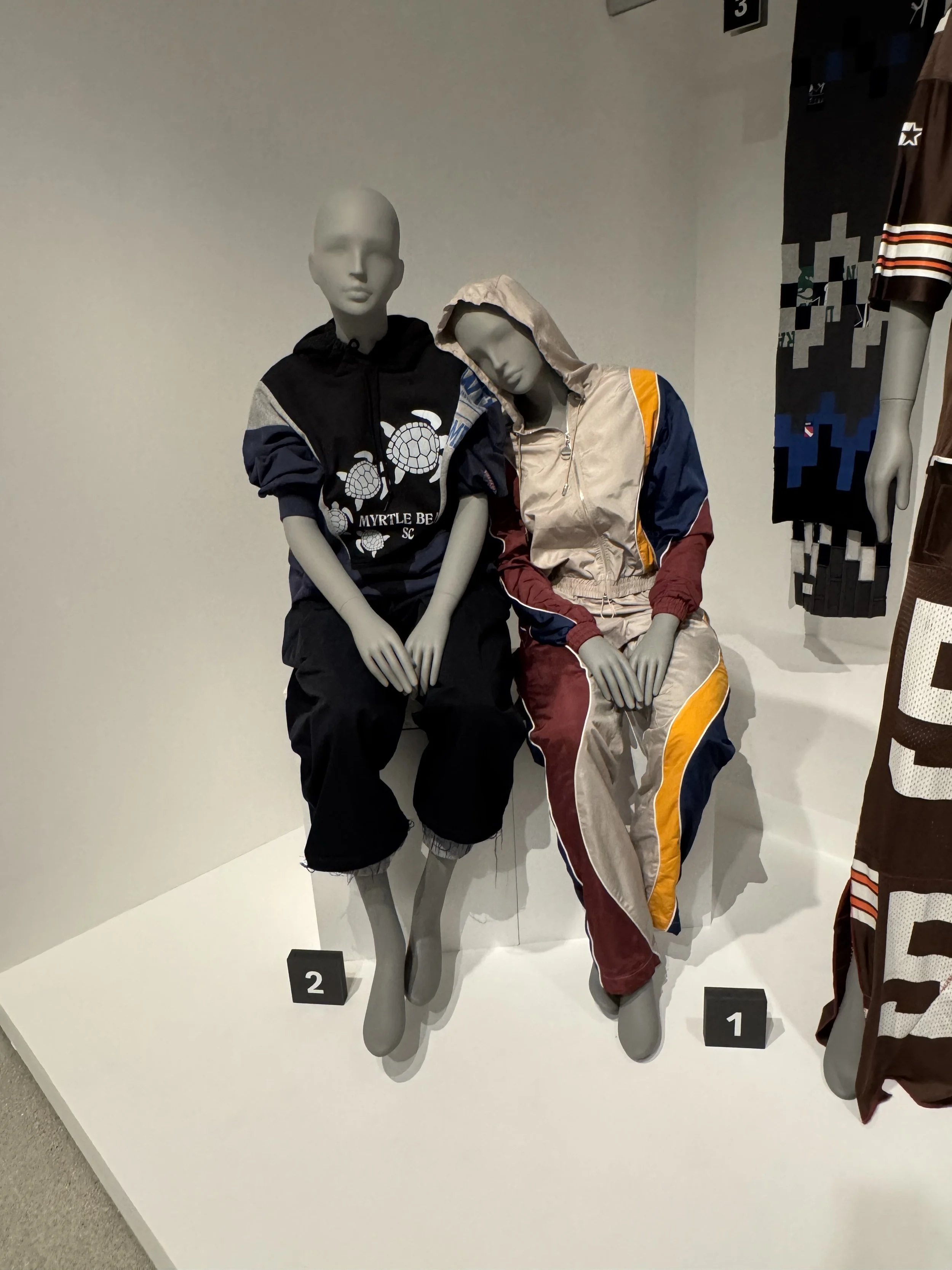 And tucked quietly in the same room, a pair of seated figures in reworked sportswear — one an Ahluwalia piece — hint at the everyday roots of upcycling. A reminder that reuse isn’t just couture; it’s cultural