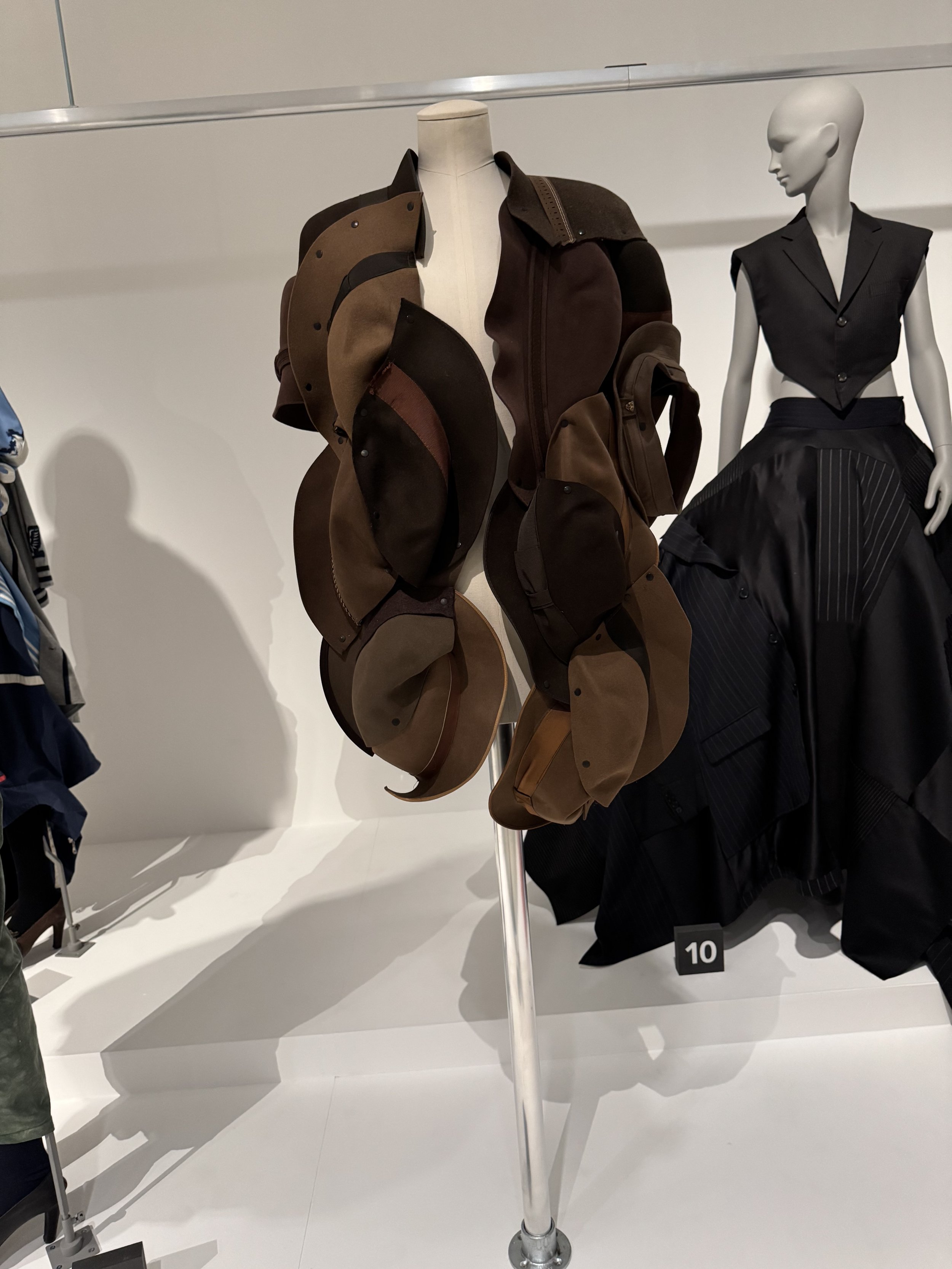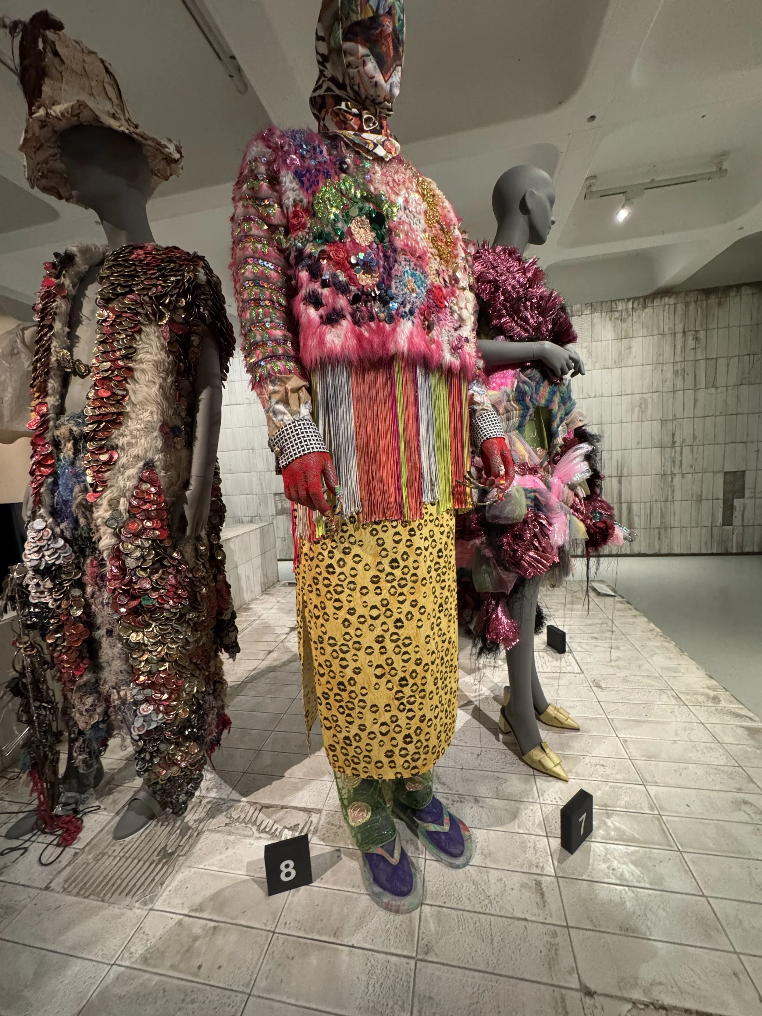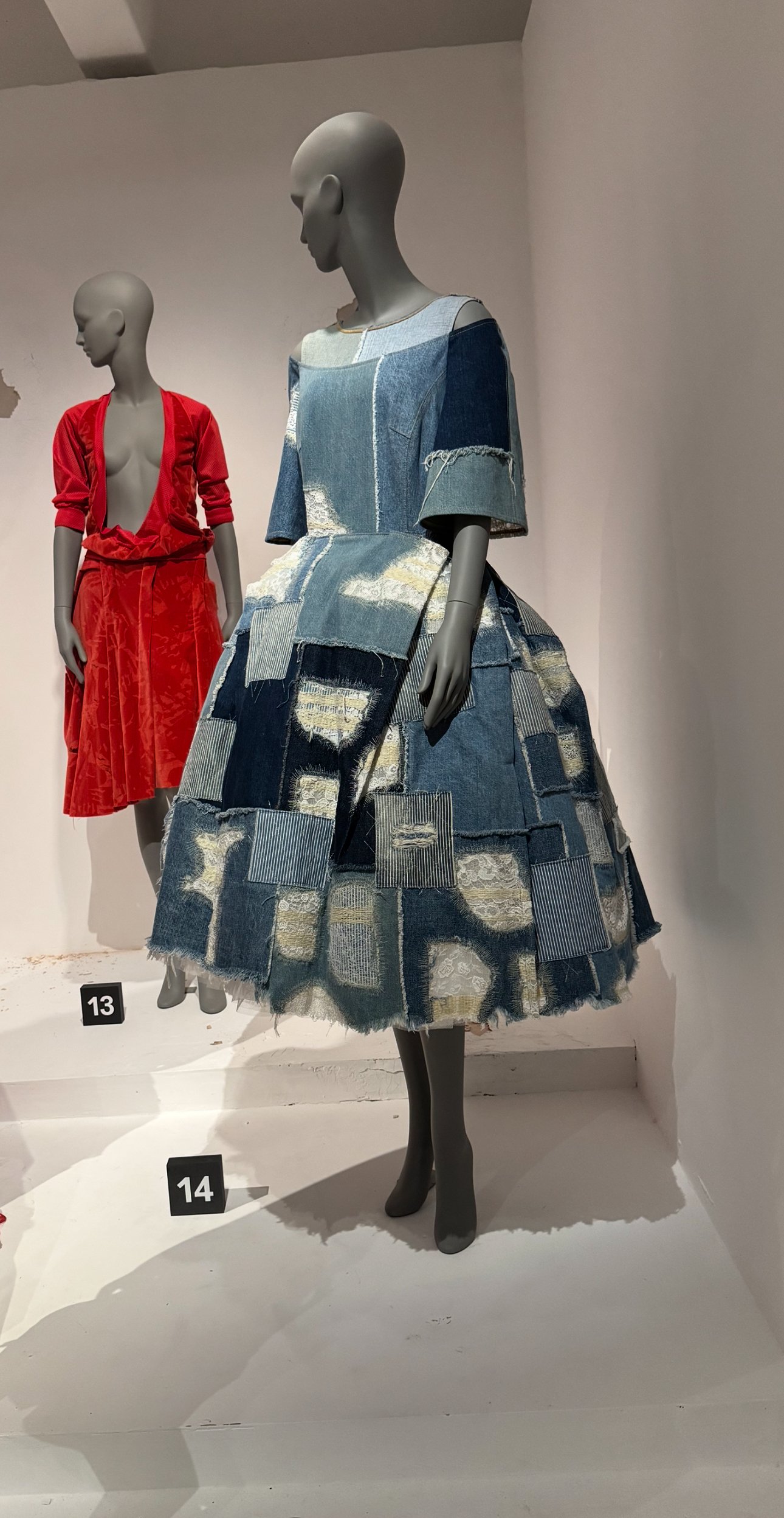 And tucked quietly in the same room, a pair of seated figures in reworked sportswear — one an Ahluwalia piece — hint at the everyday roots of upcycling. A reminder that reuse isn’t just couture; it’s cultural