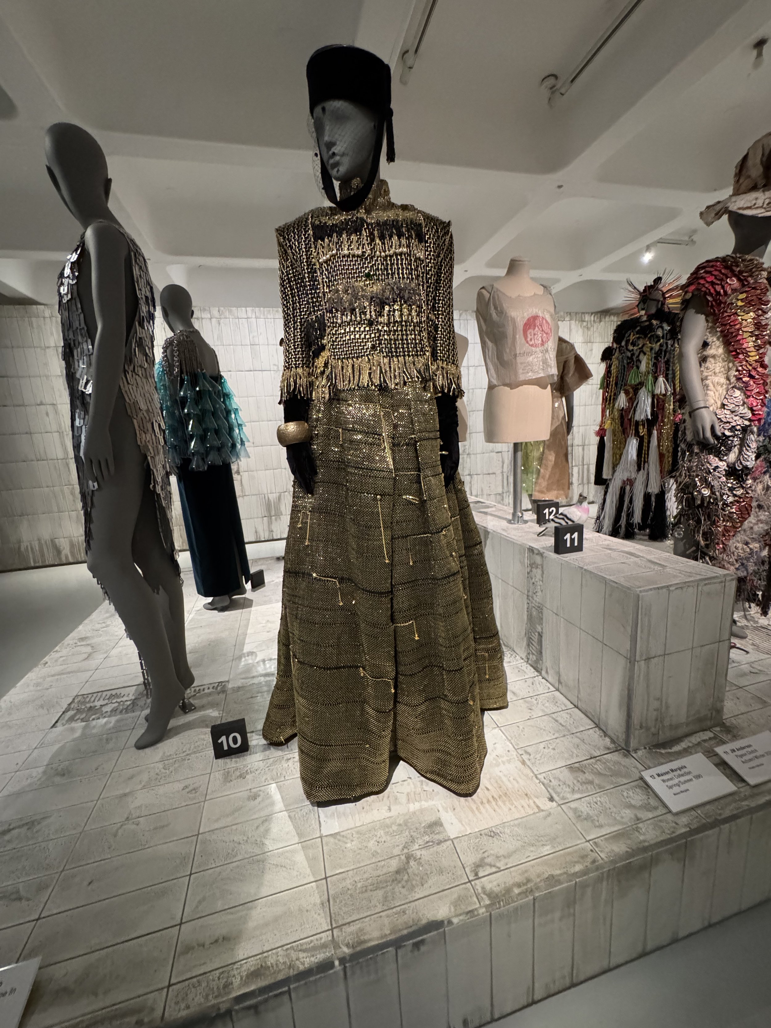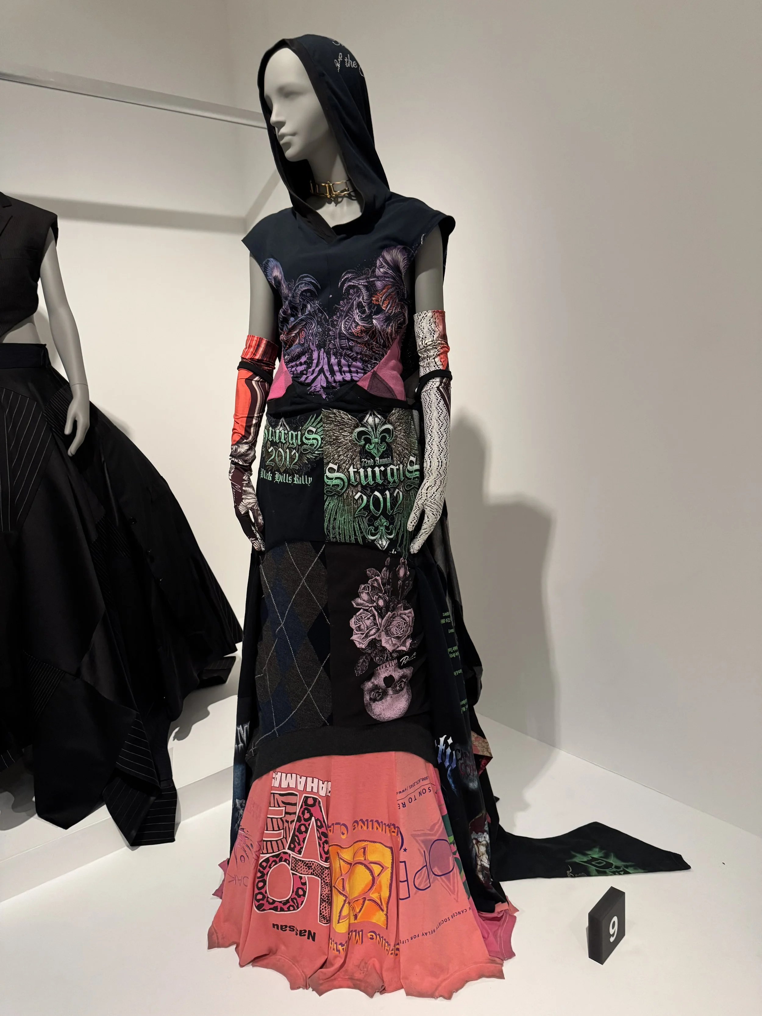 The exhibition doesn’t stop there. Among the standout pieces are Miguel Adrover’s emotionally charged Dress With a Soul Inside, Out of My Mind (A/W 2012), stitched together from reclaimed materials that feel almost autobiographical. Marine Serre’s hooded Hard Drive gown (A/W 2022) — crafted from vintage T-shirts and deadstock fabrics — glows like something salvaged from a future world. Nina Hollein’s Suit-Up Dress (2020) reshapes men’s shirts into a statement on quiet sustainability, while Maison Margiela’s archival Women Collection (A/W 2004) reminds us that deconstruction has always been part of fashion’s DNA.
