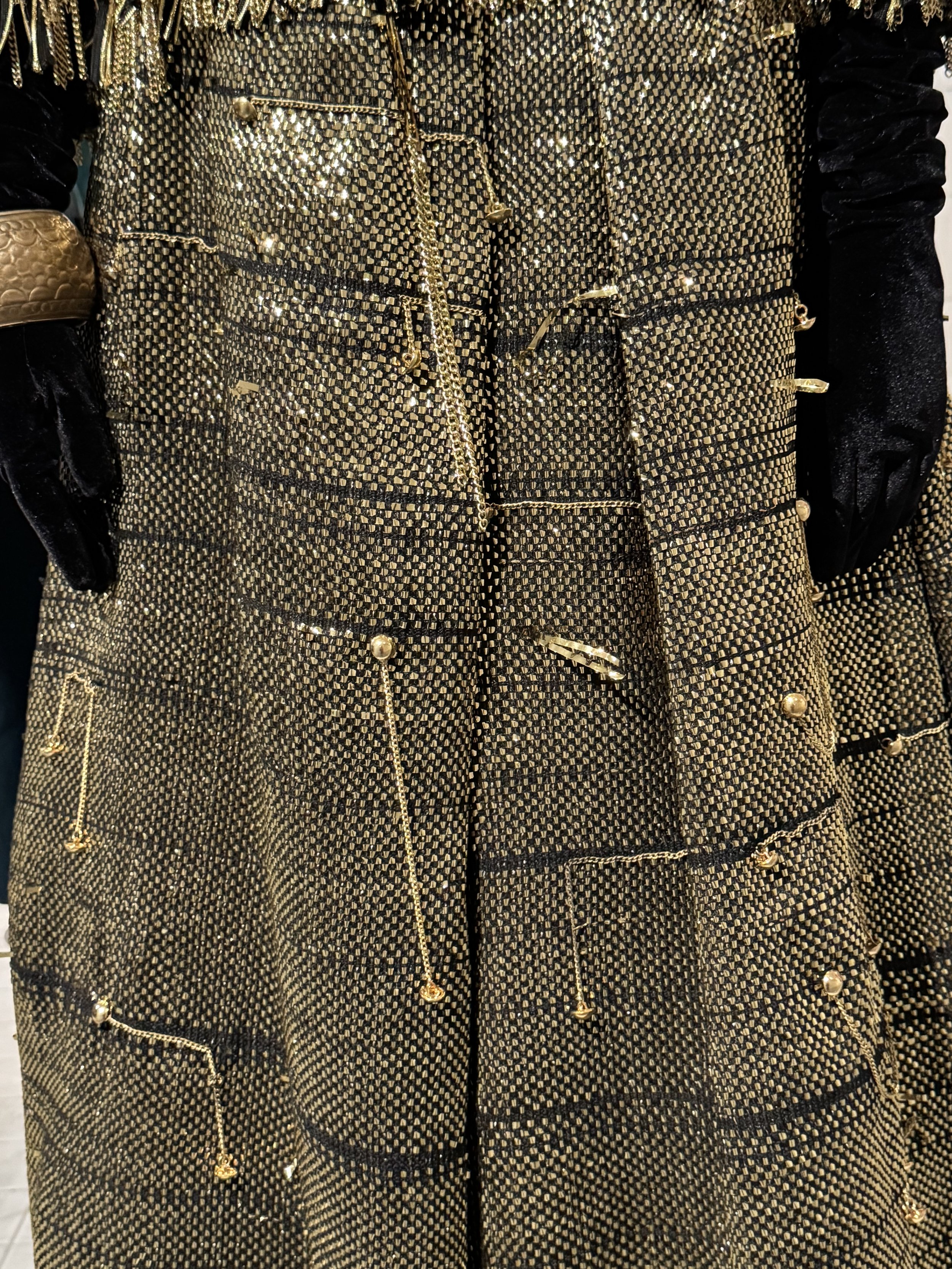 Van der Kemp’s gold gown — “Nikita, Let the Sun Shine In” — stops you in your tracks. It’s pure opulence, but made from discarded trimmings, pearls, and vintage metal chains. Every piece of gold thread and chain is rescued, reworked, and rewoven into something radiant.