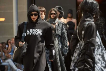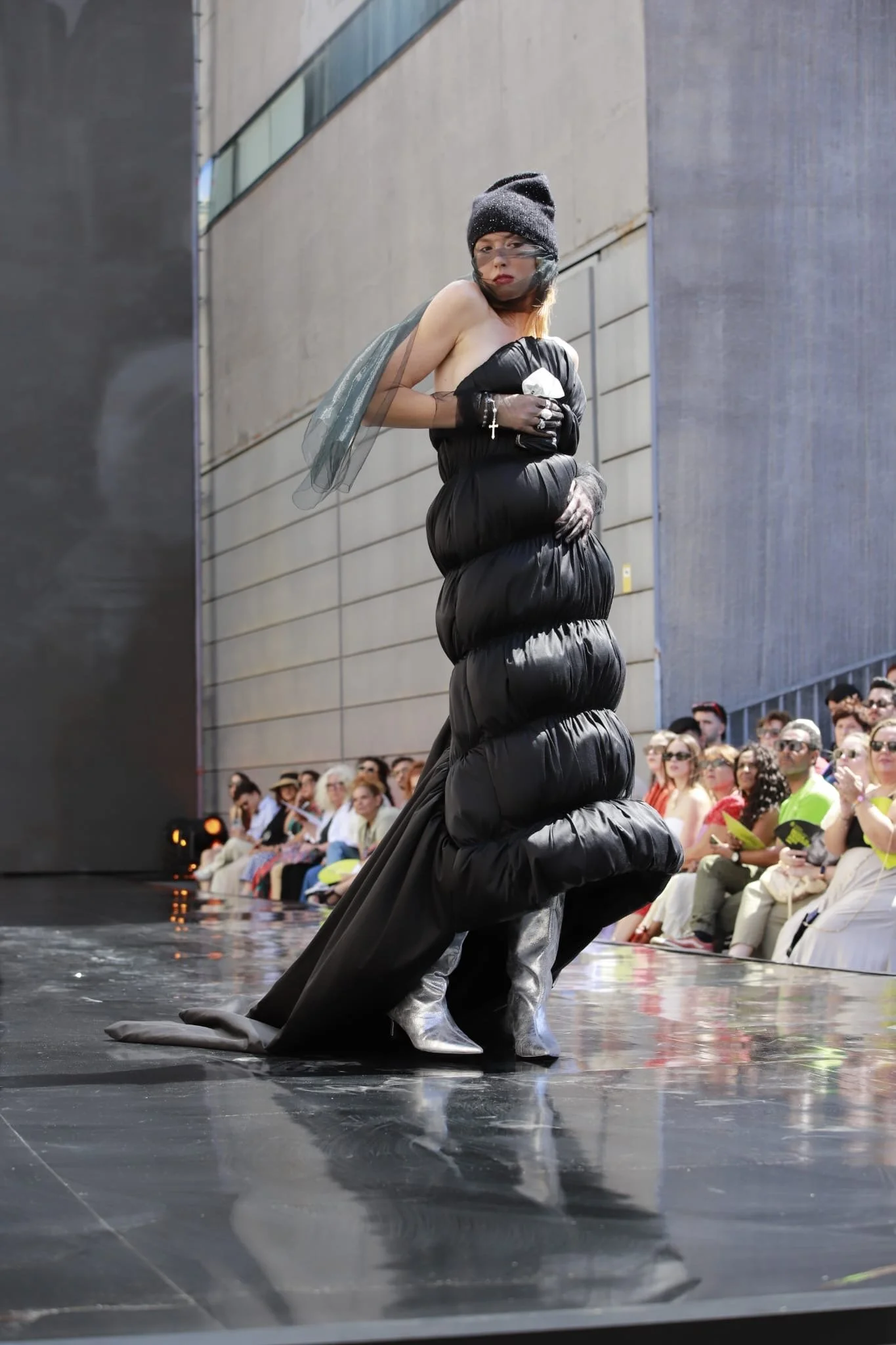 Oversized dresses and quilted coats ( a signature ) dominate the runway, their volume giving physical form to emotional weight. Material contrasts: like tulle offer movement and softness, while neoprene, twill, and structured wool bring solidity and control. Virgin Mary medals become ornamentation—draped on jackets, pants, bras and skirts, are used like armor. These aren’t embellishments; they’re symbols of both reverence and resistance. Reworked garments tell stories of transformation—each one previously worn, now cut, reassembled, and charged with new meaning.